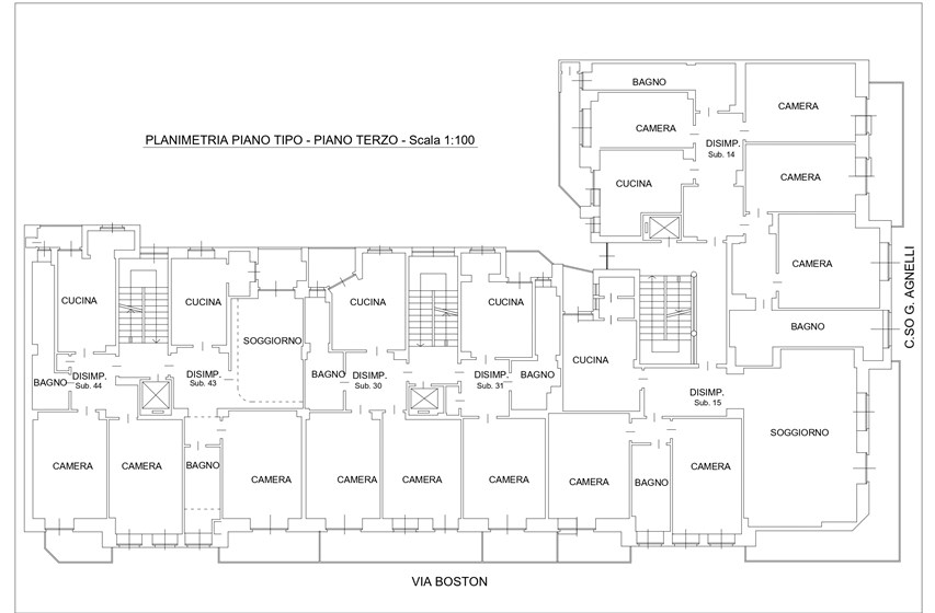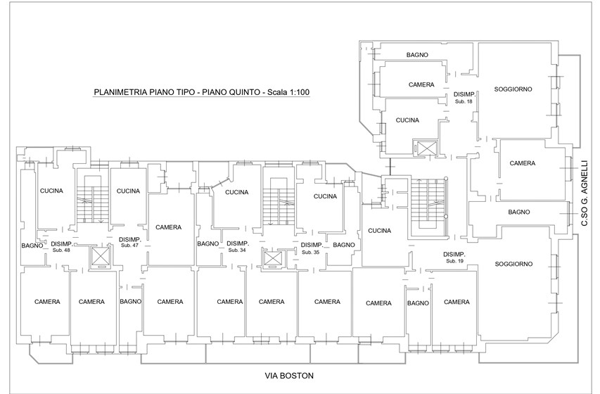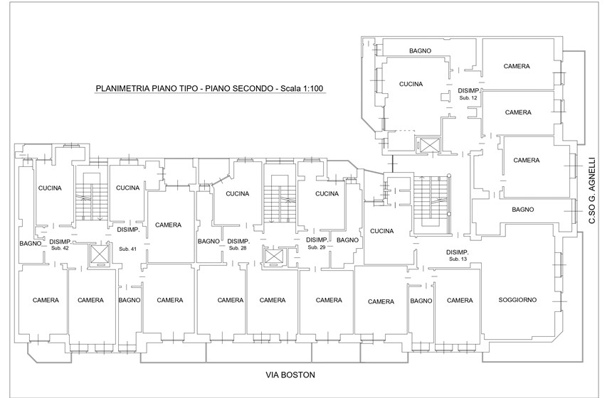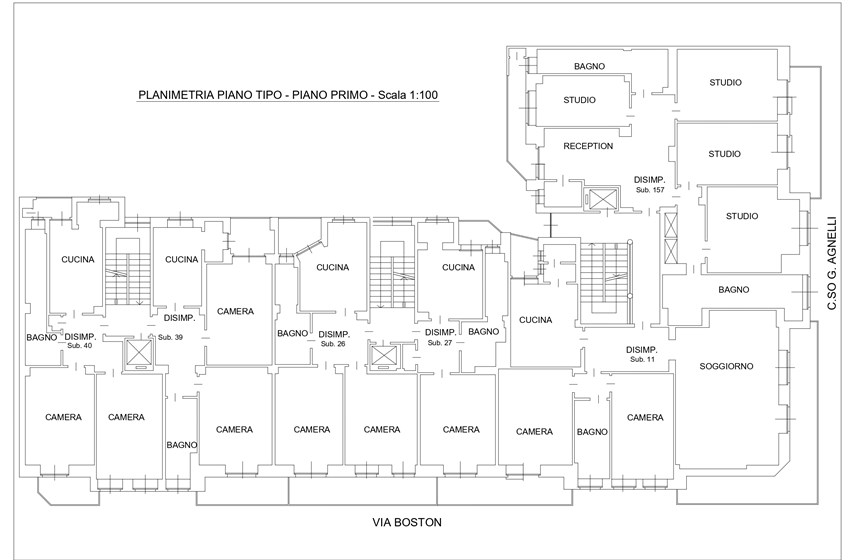 Il complesso è situato in Corso Agnelli 66, all’angolo con via Boston 2 e 4, nel cuore del quartiere Santa Rita. La zona è caratterizzata da un tessuto sia residenziale vivace e sicuro, sia commerciale e ricco di negozi di vicinato, scuole, supermercati e collegamenti pubblici che lo rendono particolarmente comodo e funzionale. Nelle immediate vicinanze si trovano alcuni dei poli più importanti della città: lo Stadio Olimpico Grande Torino e il Pala Alpitour distano appena 900m, mentre il polmone verde di Piazza d’Armi si raggiunge in soli 10 minuti di camminata. L’area ospita anche la Facoltà di Economia, situata a circa 800m. A completare il contesto, il mercato rionale di Corso Sebastopoli a meno di 10 minuti a piedi. La posizione offre inoltre collegamenti rapidi con il centro della città, raggiungibile in circa 15 minuti in auto o con i mezzi pubblici, mentre la vicinanza alle principali arterie stradali consente di spostarsi agevolmente anche verso le tangenziali e le uscite autostradali. L’edificio, realizzato negli anni ‘60, si sviluppa su otto piani sul fronte di Corso Agnelli e sette piani sul lato di Via Boston, distinguendosi per la sua posizione angolare di forte visibilità. La proprietà presenta una destinazione mista, con spazi a uso commerciale al piano terra e unità abitative ai piani superiori, soluzione che conferisce allo stabile grande versatilità d’impiego. Il complesso ospita unità caratterizzate da ambienti ampi e luminosi di diverse metrature, con la presenza di pertinenze quali cantine e box auto. Gli appartamenti dispongono di balconi generosi, alcuni con doppio affaccio, che assicurano un’illuminazione naturale costante e viste aperte su due lati. Recentemente sono stati realizzati interventi di manutenzione straordinaria che hanno migliorato la qualità e l’efficienza dello stabile: installazione di serramenti nuovi, sostituzione dei portoncini blindati, completo rifacimento dei vani scala e aggiornamento dell’ascensore.