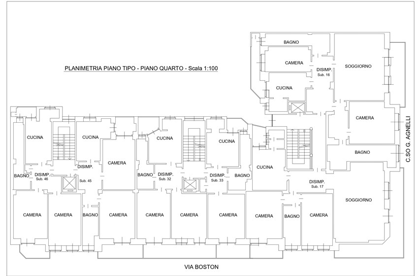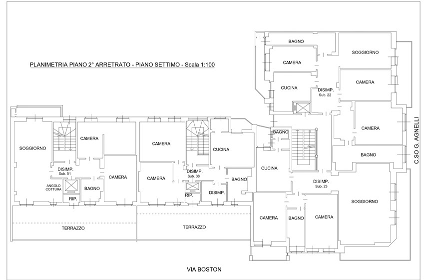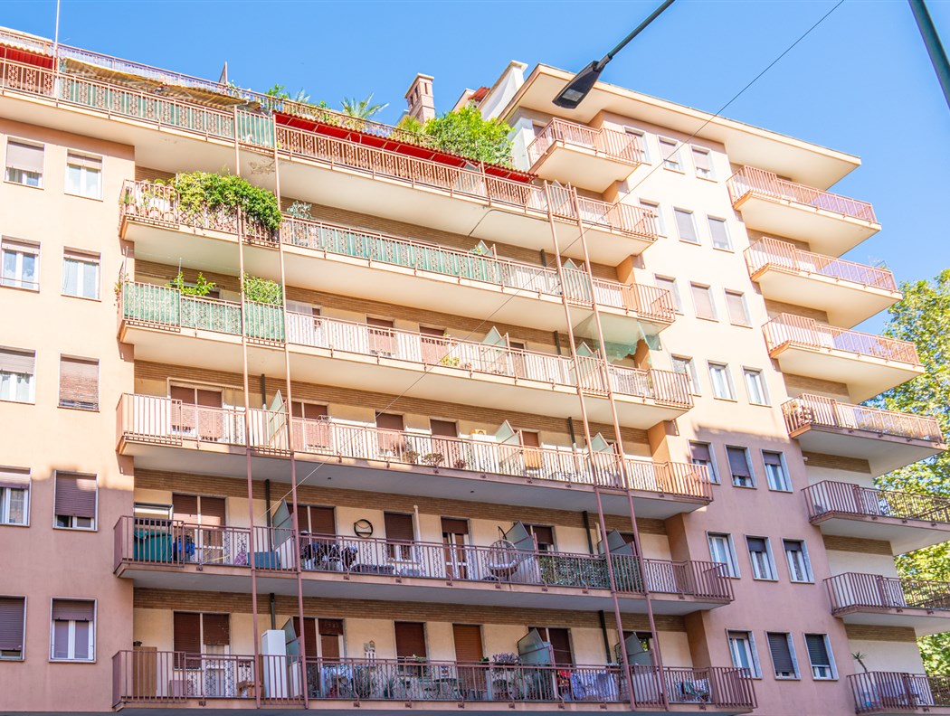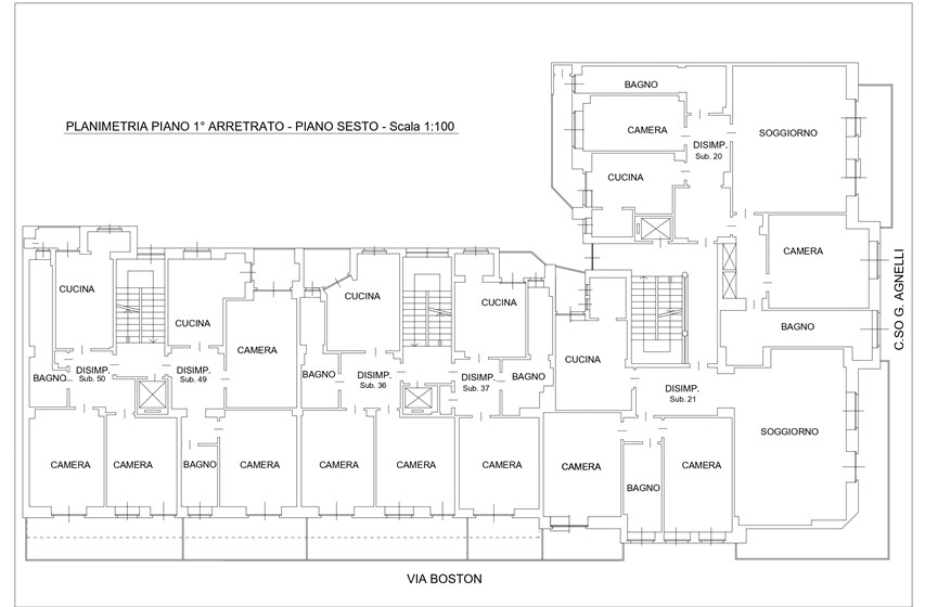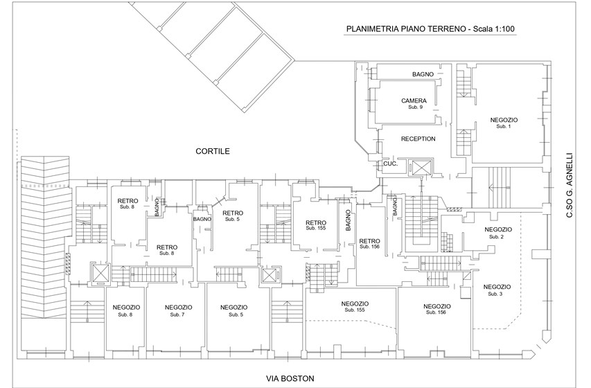 Il complesso è situato in Corso Agnelli 66, all’angolo con via Boston 2 e 4, nel cuore del quartiere Santa Rita. La zona è caratterizzata da un tessuto sia residenziale vivace e sicuro, sia commerciale e ricco di negozi di vicinato, scuole, supermercati e collegamenti pubblici che lo rendono particolarmente comodo e funzionale. Nelle immediate vicinanze si trovano alcuni dei poli più importanti della città: lo Stadio Olimpico Grande Torino e il Pala Alpitour distano appena 900m, mentre il polmone verde di Piazza d’Armi si raggiunge in soli 10 minuti di camminata. L’area ospita anche la Facoltà di Economia, situata a circa 800m. A completare il contesto, il mercato rionale di Corso Sebastopoli a meno di 10 minuti a piedi. La posizione offre inoltre collegamenti rapidi con il centro della città, raggiungibile in circa 15 minuti in auto o con i mezzi pubblici, mentre la vicinanza alle principali arterie stradali consente di spostarsi agevolmente anche verso le tangenziali e le uscite autostradali. L’edificio, realizzato negli anni ‘60, si sviluppa su otto piani sul fronte di Corso Agnelli e sette piani sul lato di Via Boston, distinguendosi per la sua posizione angolare di forte visibilità. La proprietà presenta una destinazione mista, con spazi a uso commerciale al piano terra e unità abitative ai piani superiori, soluzione che conferisce allo stabile grande versatilità d’impiego. Il complesso ospita unità caratterizzate da ambienti ampi e luminosi di diverse metrature, con la presenza di pertinenze quali cantine e box auto. Gli appartamenti dispongono di balconi generosi, alcuni con doppio affaccio, che assicurano un’illuminazione naturale costante e viste aperte su due lati. Recentemente sono stati realizzati interventi di manutenzione straordinaria che hanno migliorato la qualità e l’efficienza dello stabile: installazione di serramenti nuovi, sostituzione dei portoncini blindati, completo rifacimento dei vani scala e aggiornamento dell’ascensore.